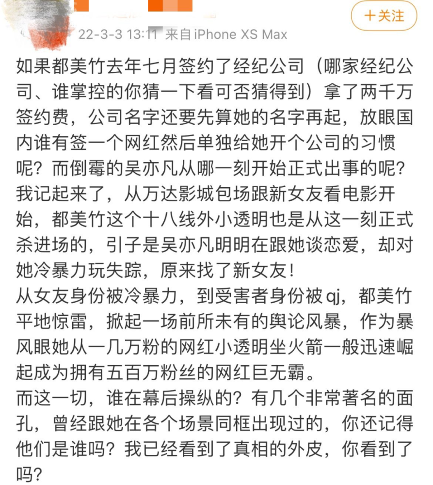 除此之外,还有一些“阴谋论学者”各种分析假设,称都美竹锤吴亦凡一事本质上就是一场有预谋的舆论大战,从一开始,都美竹背后就有高人和资本大佬、公司在出谋划策,她的出圈是资本踩着吴亦凡的翻车精心炮制出来的,全然把吴亦凡洗白成了什么都不懂的名利场上傻白甜……