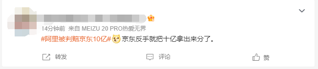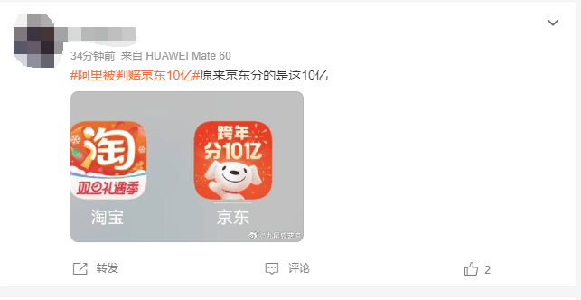 今日,词条#阿里被判赔京东10亿#登上微博热搜,引起关注。事件起因是“京东黑板报”发布《关于京东诉阿里巴巴“二选一”案一审胜诉的声明》。《声明》称,北京市高级人民法院做出判决,认定阿里巴巴滥用市场支配地位实施“二选一”的垄断行为成立,对京东造成严重损害,并判决向京东赔偿10亿元。